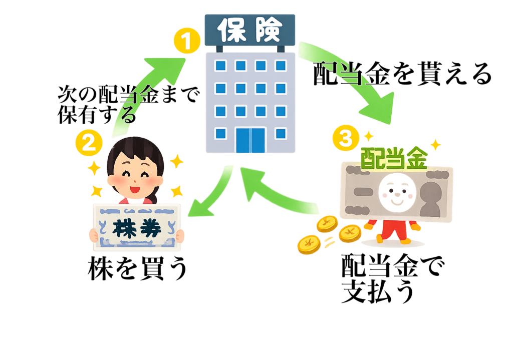 株を買う→配当金が出る→配当金で保険料を支払う→次の配当金まで株を保有する→配当が出る