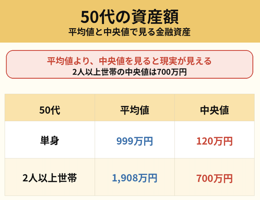 だからこそ、50代の資産額を見るときは、平均値よりも中央値の方が現実に近いと感じます。