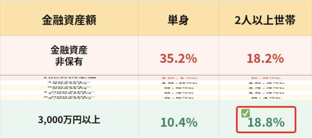 特に2人以上世帯では、金融資産非保有よりも3,000万円以上の世帯の方が多いという結果でした。