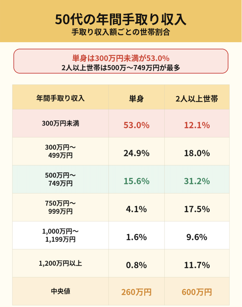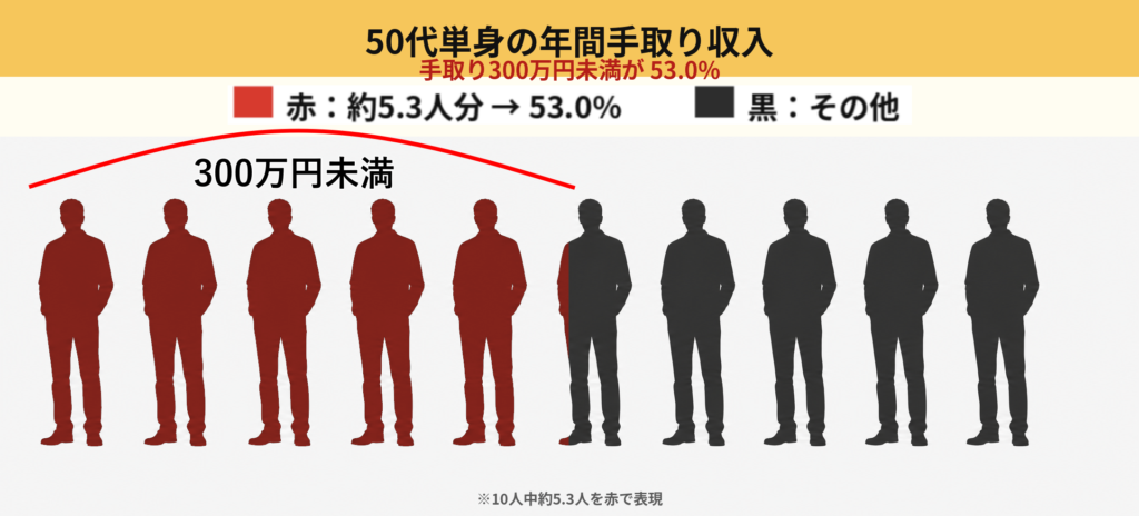 ここで私が予想より多いと感じたのは、50代単身のうち、手取り収入300万円未満の人が半数を超えていることです。