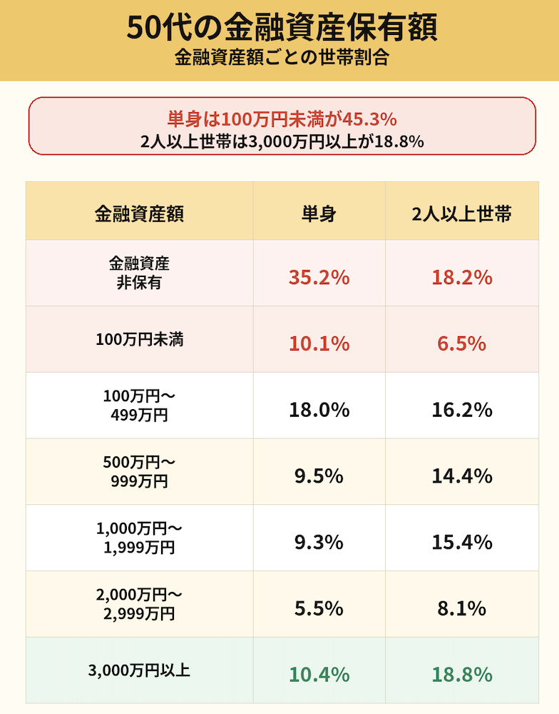 50代は資産ゼロも多いが、3,000万円以上も意外と多い