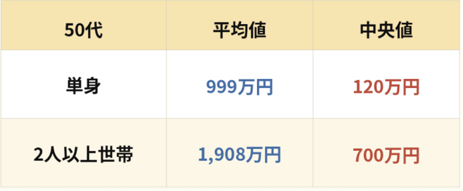 平均値を見ると、50代単身でも約1,000万円、2人以上世帯では約1,900万円あるように見えます。