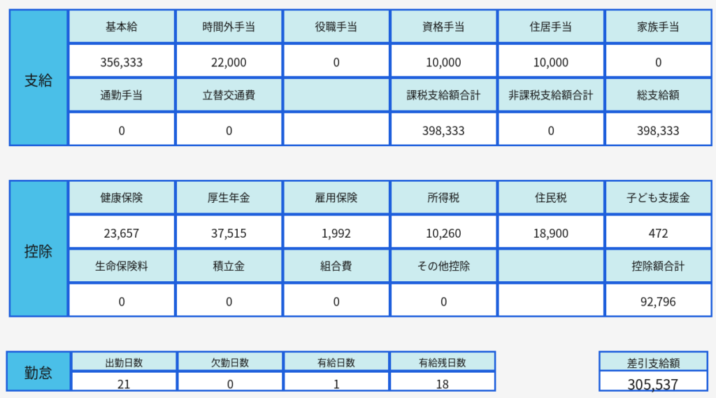 たとえば今回のモデルでは、主に次のようなものが毎月の給料から引かれます。